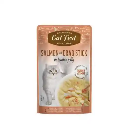 El Filete de Salmón Salvaje con Palitos de Cangrejo en Gelatina es un producto nutritivo y delicioso para gatos adultos. El alto contenido de salmón y palitos de cangrejo proporciona proteínas esenciales y ácidos grasos para apoyar la salud y la vitalidad de tu gato. Se sirve como alimento natural complementario. Este noble pescado es rico en ácidos grasos Omega-3, que son cruciales para promover la salud del corazón y mejorar la función cerebral en gatos, al mismo tiempo que ayuda a mantener un pelaje brillante y saludable. Además de los ácidos grasos Omega-3, el salmón es una excelente fuente de proteína de alta calidad.