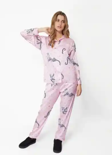 Pijama camisero de 2 piezas, color rosado. Camisa manga larga y pantalón elasticado, tela estampada con diseños exclusivos de la marca 94% polyester y 6% spandex, lavar a mano con agua fría, no planchar, secar en sombra y no en secadora