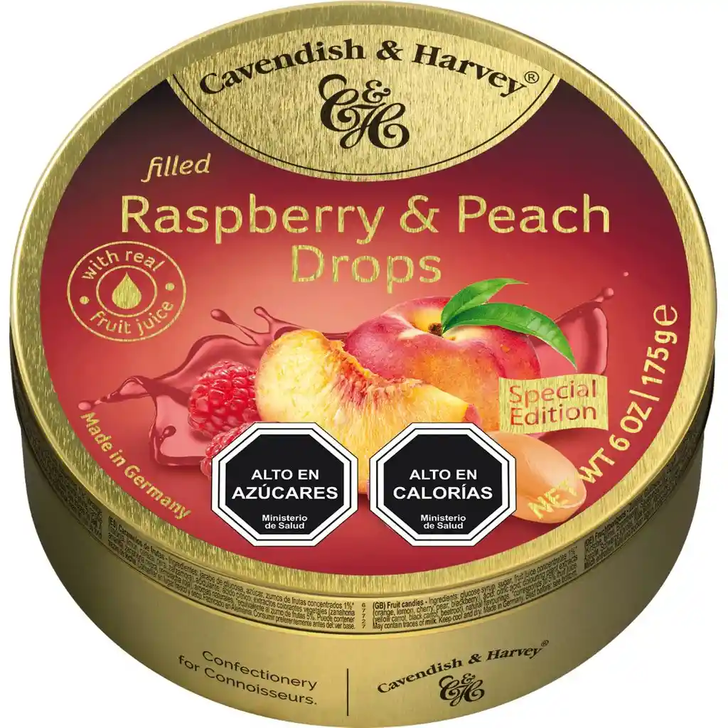 Gotas rellenas de frambuesa y melocotón, deliciosas, celestiales, se complementan entre sí para crear un cóctel de pura indulgencia.