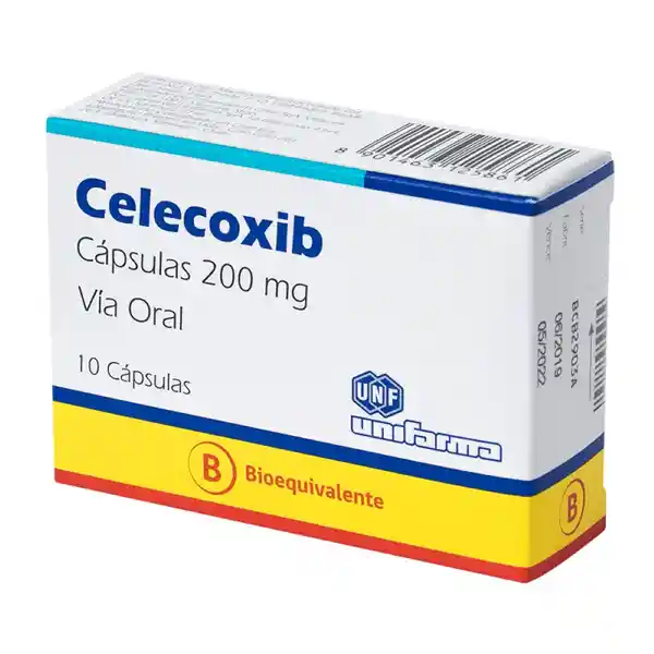 Principio Activo: Celecoxib. Concentración: (200 mg). Forma Farmacéutica: Cápsulas. Equivalencia Terapéutico. Con 10 Cápsulas.