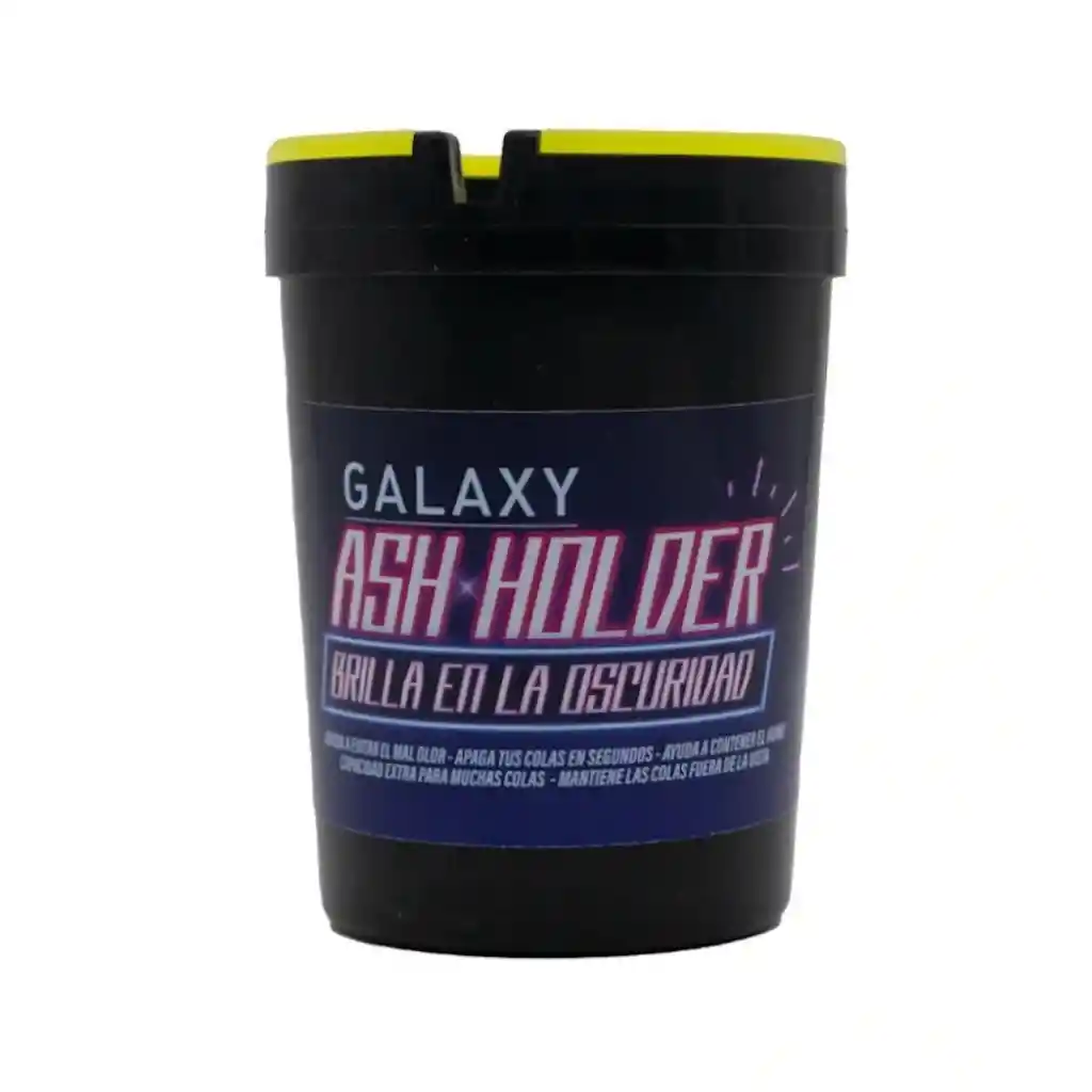 Cenicero Galaxy Ash Holder con tapa fluorescente que brilla en la oscuridad. Incluye 3 ranuras y orificio central para colillas, ayudando a reducir olores y mantener el espacio ordenado. Medidas: 10.5 cm alto × 7.5 cm diámetro.