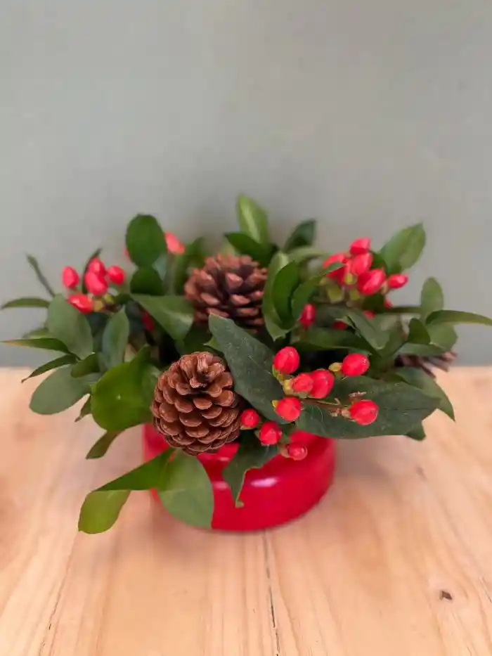 Arreglo floral con flores frescas en tonos rojos y verdes, presentado dentro de un florero de vidrio rojo. ¡Ideal para decorar la mesa esta Navidad! Incluye: 5 piñas, 5 hipericum y ruscus Florero de vidrio rojo Arreglo floral navideño con espuma floral Tips de cuidado: Agregar agua todos los días a la espuma floral para siempre estén hidratadas las flores. *Altura aproximada de arreglo 20 cms y diametro 30 cms.
