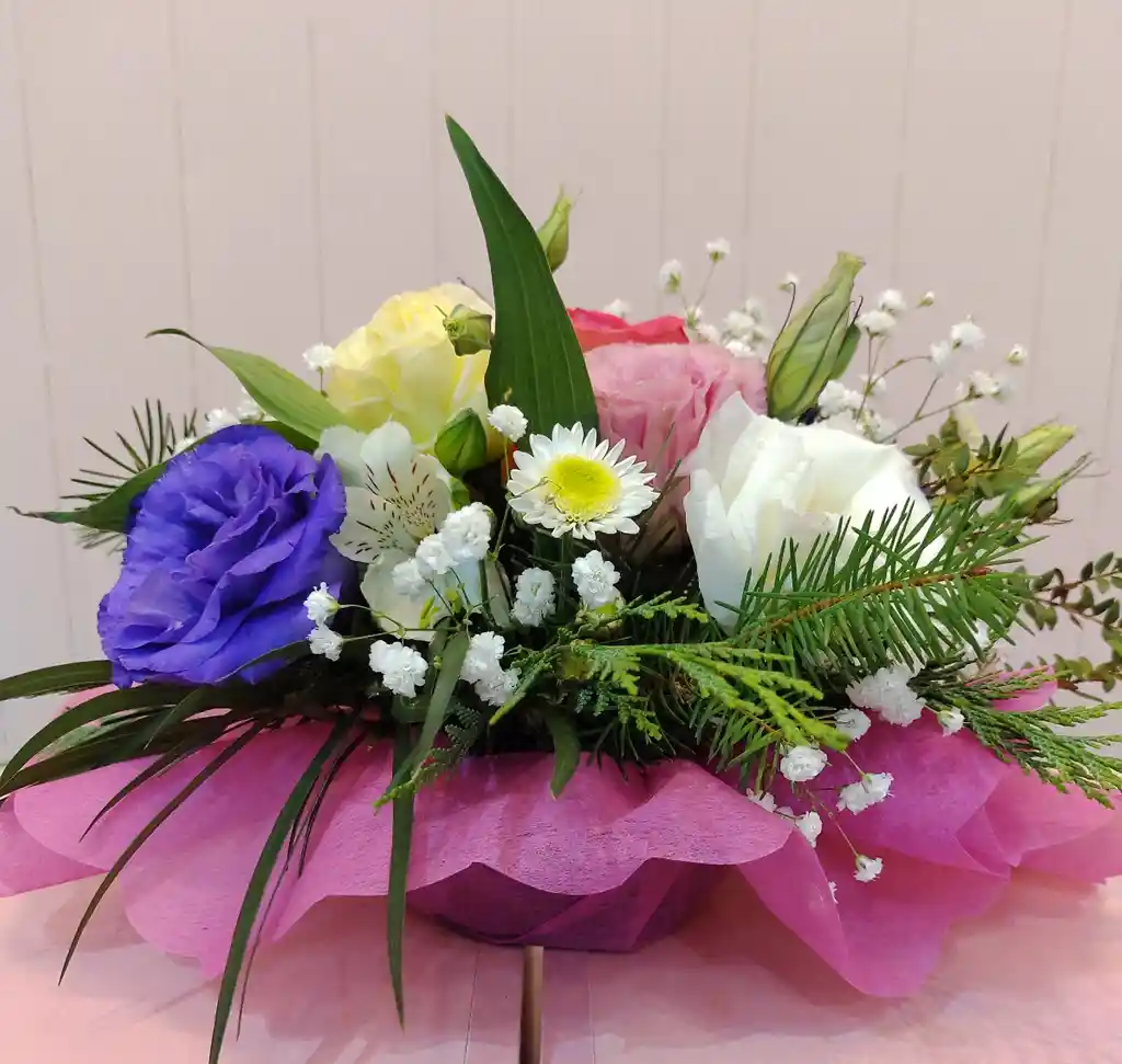 Centro de mesa redondo elaborado con mix de flores, segun stock disponible. Diametro aprox 25cms.