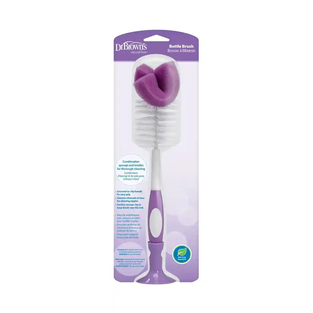 Cepillo Limpia Mamaderas Violeta Dr Brown's. Características: Combinación de esponja y cerdas para lograr una limpieza minuciosa. Mango ranurado antideslizante para un fácil agarre. Canales en V invertida en la base para limpiar las tetinas. Ventosa en la base para colocarlo cerca del lavaplatos. Sin BPA.