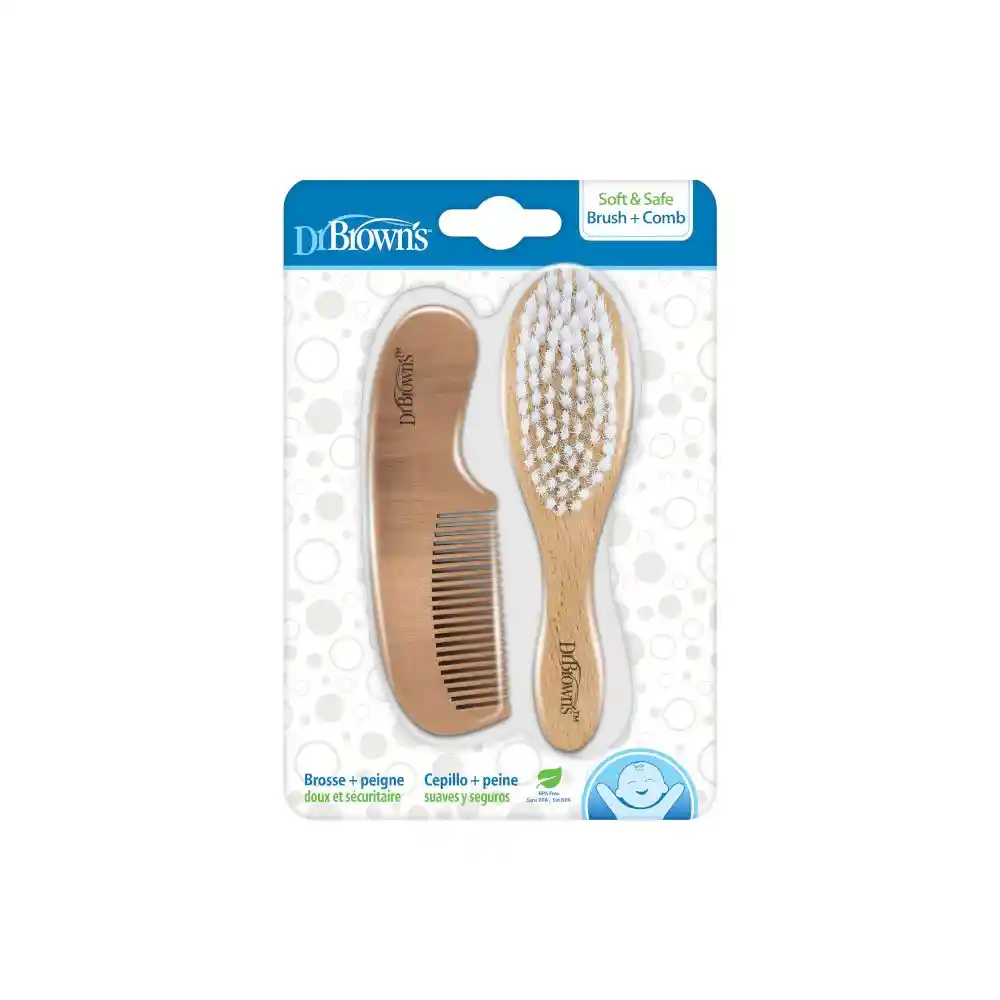 Consiente el cabello de tu pequeño con el cuidado suave y delicado del Cepillo y Peineta Dr. Brown's. El cepillo cuenta con cerdas que acarician el cuero cabelludo del bebé, evitando cualquier rasguño o molestia. Mientras tanto, la peineta está hecha de madera con dientes que desenredan el cabello delicado de tu bebé. Este set es la combinación perfecta de funcionalidad y suavidad para ayudarte a cuidar la cabecita de tu bebé con amor y cuidado. Cualidades: Cerdas suaves y delicadas. Peine seguro de puntas redondeadas. Ayuda a prevenir la costra láctea. Para limpiar: Lave el cabello y el peine con agua tibia jabonosa y dejar secar al aire Edad recomendada del usuario: desde recién nacido