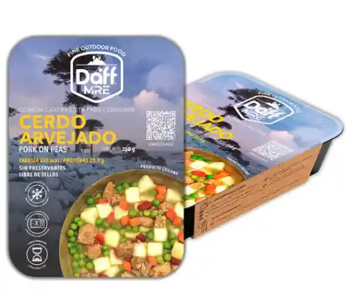 Cerdo Arvejado en formato de Bandeja Individual de 350 Grs. De fácil transporte y practica manipulación al momento de servir, debido a su nuevo formato de bandeja que evita el derrame de alimento entregándote una experiencia de mayor comodidad. No requiere refrigeración, es de larga duración y muy fácil de calentar. Opciones para Calentar: Microondas (2 minutos) Baño María. Horno Combinado Automático Eléctrico a 125°C (20 minutos) Calentador Autónomo Daff. (10-12 minutos) Información Nutricional: