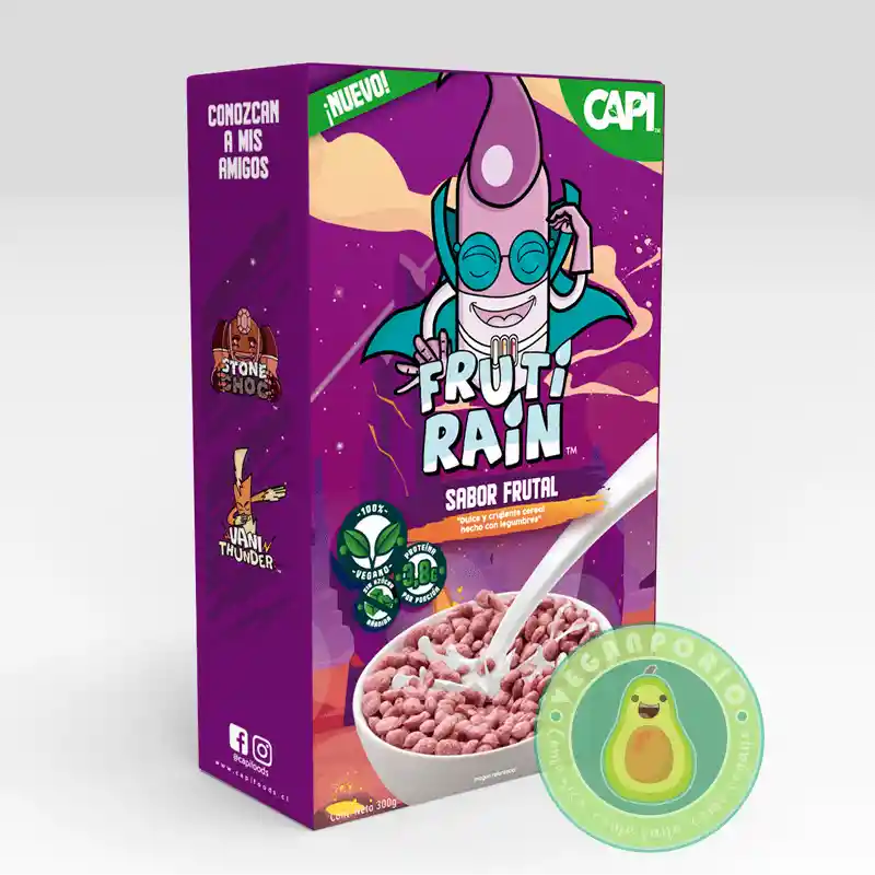Cereal fruti rain. Hecho en base a harina de legumbres (poroto, lenteja y garbanzo). Sin sellos.