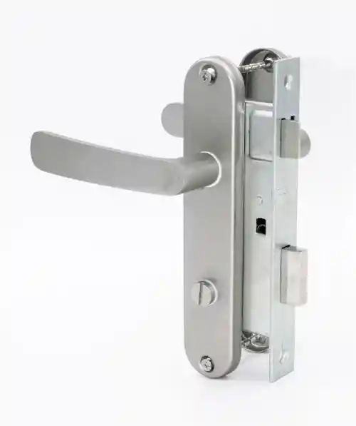 Set cerradura y manilla para puertas de baño (interior) hasta 45 mm de espesor. Uso en puertas izquierda. Para puerta derecha se debe invertir la condena (instrucciones en el empaque). Puertas de apertura interior y exterior. Backset de 41 mm. Picaporte reversible. Incluye elementos de instalación