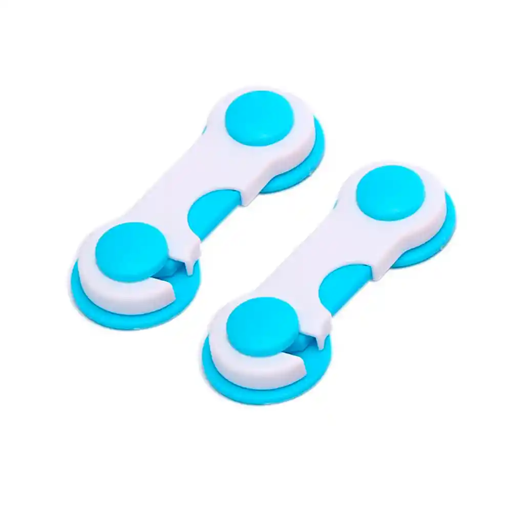 Material: Plástico Color: Celeste con Blanco Tamaño: 9,5 cm x 4 cm aprox Contenido: 2 Tope de Seguridad. Asegúrese de que la superficie esté limpia y seca antes de la instalación Retire las cubiertas adhesivas traseras y pegue el cierre de seguridad Ideal para armarios de almacenamiento, cajones y puertas cerradas