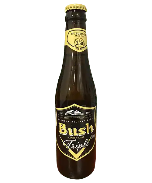 Cerveza Bush Blonde Triple 330cc Bush Blonde Triple Bush Blonde Triple, Creada con motivo del 10 aniversario de la Bush Blonde en 2008, la Bush Blonde Triple de la cervecera Dubuisson es una cerveza belga fuerte, fruto de una experiencia adquirida a los largo de 240 años. De hecho, la elabora la Brasserie Dubuisson, que es actualmente la cervecera más antigua en activo de Valonia (sur de Bélgica). Contrariamente a su hermana pequeña, la Bush Blonde, esta Bush Blonde triple disfruta de una fermentación añadida en botella. Esta fermentación en botella provoca literalmente una explosión de aromas ya muy presentes en la BUSH Blonde. La Bush Blonde triple adquiere en su vaso un color doradorelativamente rubio y opaco para una cerveza rubia. En nariz, libera aromas afrutados y especiados que recuerdan a fruta de carne blanca y cítricos, así como el cilantro y la levadura. El alcohol está relativamente presente pero no enmascara el resto de los olores. En boca, encontramos sabores muy afrutadoscombinados con notas especiadas que evocan el cilantro y efluvios de alcohol que realzan el conjunto. El alcohol se manifiesta en un final seco y que deja poco lugar al amargor de los lúpulos. Se apuesta por la perfección hasta el último detalle con una magnífica botella serigrafiada dotada de un tapón tipo champán, de manera que la Bush Blonde Triple desprende un encanto indudable.