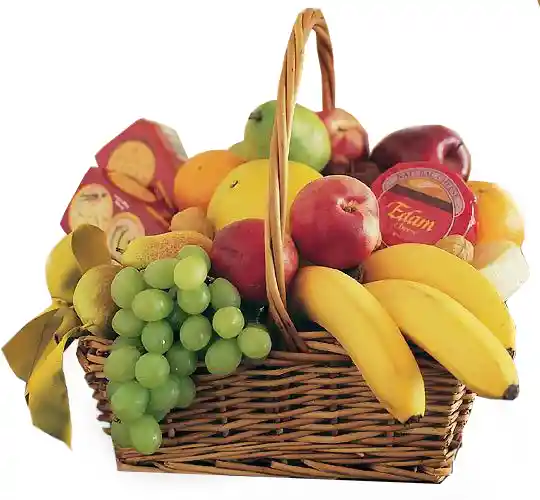 Gran cesta de mimbre, con finas frutas de temporada, seleccionadas y de primera calidad; Acompañadas de finas galletitas y queso camembert. La cesta se envuelve en papel celofán y moño de rafía. En caso de que algún producto no se encuentre disponible, será sustituído por otro de similares caractarísticas y calidad.