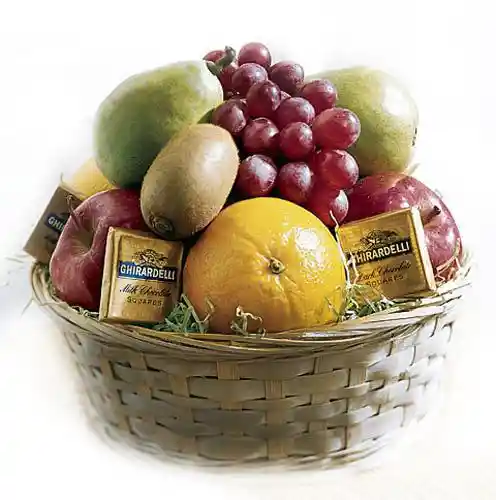 Cesta de mimbre, con finas frutas seleccionadas de primera calidad, y según temporada, acompañada de chocolatitos importados. En caso de que algún producto no se encuentre disponible, será sustituído por otro de similares características y calidad.Fotografía referencial. La cesta es envuelta en papel celofán y moño de rafía en una excelente presentación.