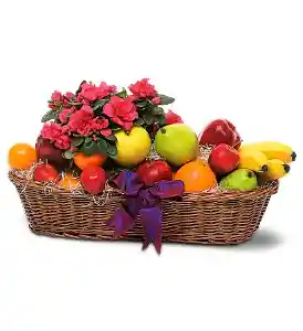 Cesta de mimbre, con finas frutas de temporada, seleccionadas y de primera calidad. Acompañadas de una flores de la época. En caso de que algún producto no se encuentre disponible, será sustituído por otro de similares caractarísticas y calidad.Fotografía referencial. La cesta se envuelve en papel celofán y moño de rafía.
