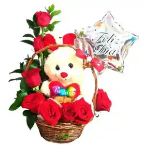 Cestita 8 Rosas, Peluche 20cm y Globo