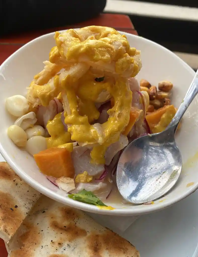 Calamares apañados Agregado de cebolla, reineta, camarón, calamar, pulpo, choclo peruano y canchita.