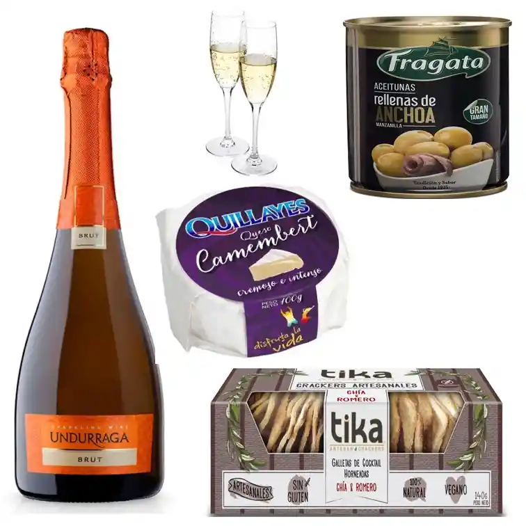 *champagne Espumante Botella 750 cc *Queso camembert 100 g *Galletas Crackers Artesanales *Aceitunas Verdes Lata *2 Copas