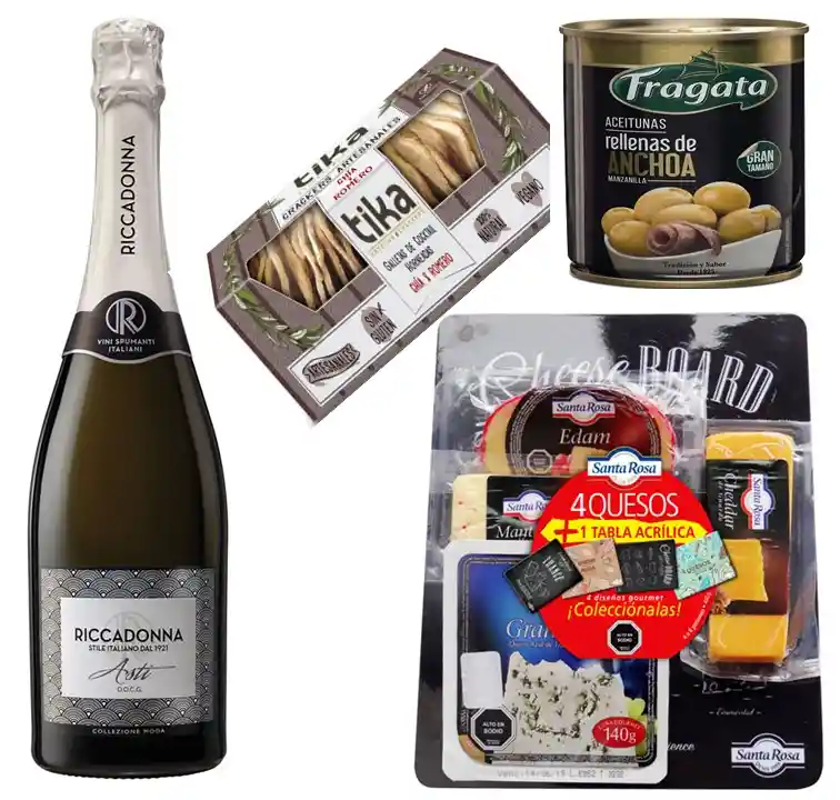 *Champagne Espumante Riccadonna 750cc *Tabla 4 Quesos *Aceitunas en Lata *Galletas Crackers Artesanales