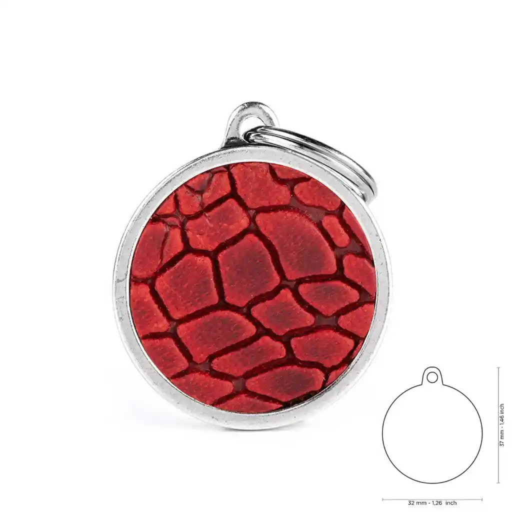 Chapa Identificadora Círculo Grande Bronx Cuero Rojo, cada placa de la colección Bronx es una pieza única, perfeccionada a mano y embellecida con un acabado en plata antigua. Las pequeñas irregularidades de las placas expresan su autenticidad y demonstran el proceso manual con el que se realizan. La colección Bronx se caracteriza por una gran variedad de tramas y decoraciones; detalles capaces de expresar el auténtica alma urbana de las afueras americanas. Made in Italy
