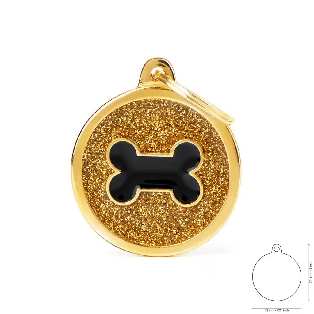 Chapita My Family – Gold Big Glitter Circle Black Bone le ayuda a mantener a su mascotita identificada. Las chapitas identificatorias son indispensables a la hora de encontrar a tu perro. Si no la tiene, nadie podrá ayudarlo a volver a casa Sin embargo si alguien quiere ayudar a un perro a regresar a casa, sólo lo puede hacer si el perro cuenta con su identificación.