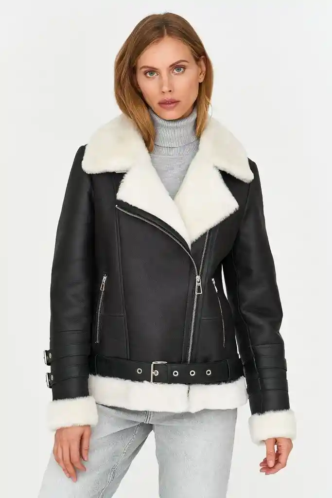 Descripción Producto: La chaqueta aviadora negra con chiporro blanco es una pieza clave para enfrentar el frío con estilo. Diseñada para mujeres que buscan abrigo y estética, combina un exterior en tono negro con un interior completo de chiporro blanco, ofreciendo calidez y contraste visual. Su corte moderno se adapta perfectamente al cuerpo, siendo ideal para usar con jeans, pantalones rectos o faldas de invierno. Un esencial versátil que complementa cualquier outfit de temporada. Atributos técnicos: •Color: Negro con chiporro blanco •Largo: Corta •Estilo: Aviadora •Material exterior: Tipo gamuza o cuerina sintética (según modelo) •Forro: Chiporro blanco sintético •Cierre: Cremallera frontal metálica •Temporada: Otoño / Invierno •Tallas disponibles: S, M, L, XL •Detalles: Diseño urbano, abrigado, femenino