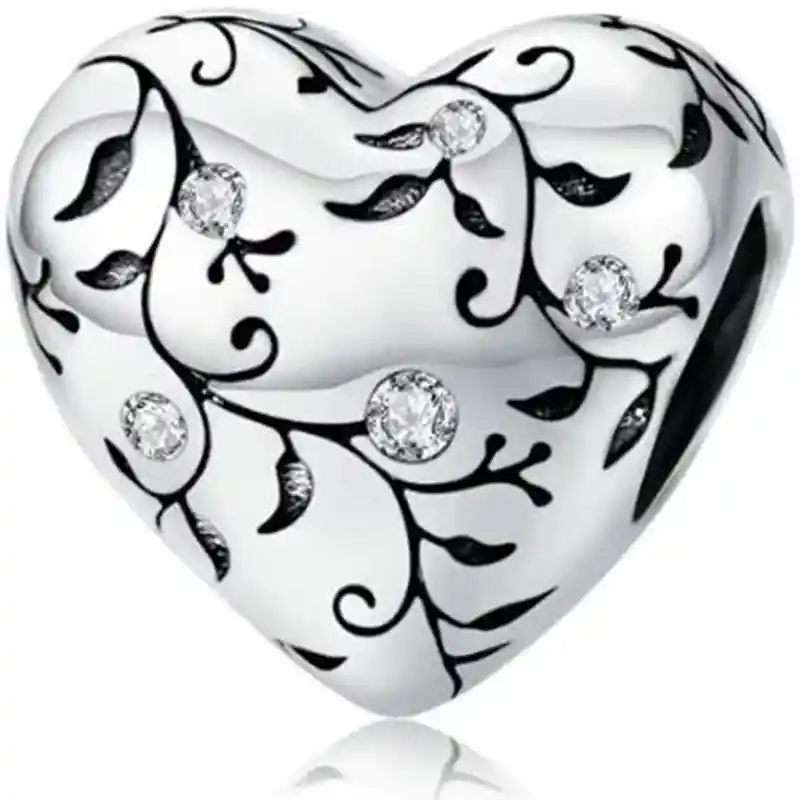 Charm Corazón Hermoso charm con forma de Corazón con estampado de enredadera y circones, fabricado en plata 925 de primera ley y cristales, 100% compatible con pulseras de charm.