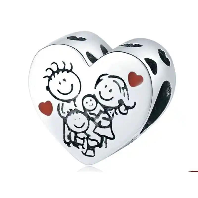 CHARM DE CORAZON CON UNA FAMILIA Hermoso charm con forma de corazón con una familia compuesta por mamá , papá ,dos hijos y una mascota, fabricado en plata 925 de primera ley y cristales, 100% compatible con pulseras de charm.