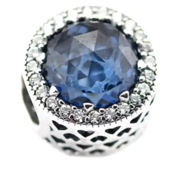 El charm está hecho de Plata esterlina 925 con su respectivo sello. Está incrustado de Zirconia cúbica de color azul. Es totalmente compatible con pulseras Pandora y cualquieras otras marcas europeas.