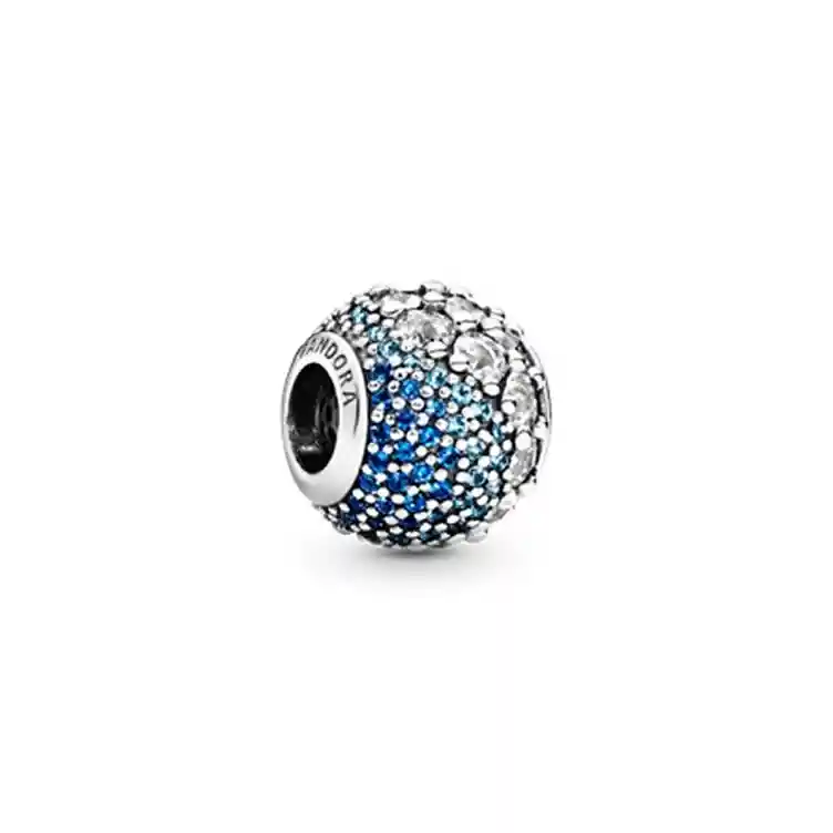El charm está hecho de Plata esterlina 925 con su respectivo sello. Está incrustado de Zirconia cúbica de color azul. Es totalmente compatible con pulseras Pandora y cualquieras otras marcas europeas.