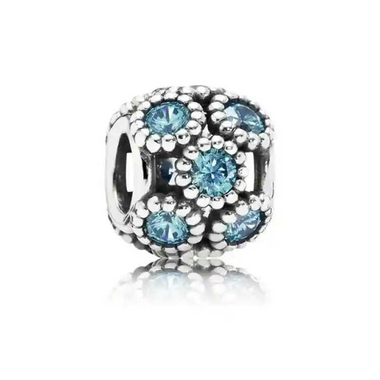 El charm está hecho de Plata esterlina 925 con su respectivo sello. Está incrustado de Zirconia cúbica. Está esmaltado en color azul. Es totalmente compatible con pulseras Pandora y cualquieras otras marcas europeas.
