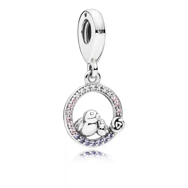 El charm está hecho de Plata esterlina 925 con su respectivo sello. Está incrustado de Zirconia cúbica de colores morado, rosado y transparente. Es totalmente compatible con pulseras Pandora y cualquieras otras marcas europeas