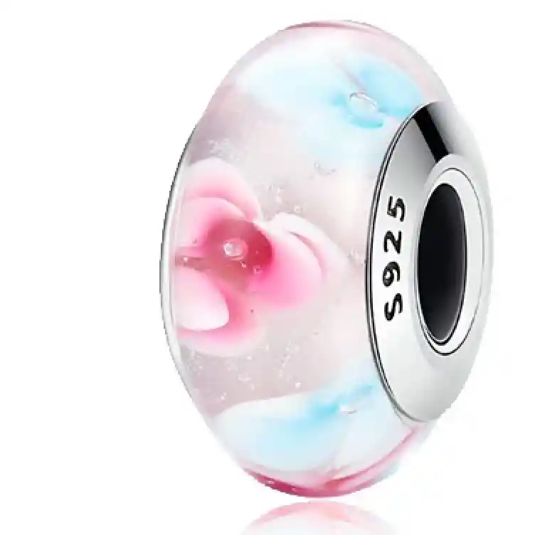 El charm está hecho de Plata esterlina 925 con su respectivo sello. Está esmaltado en colores azul, rosado y transparente. Es totalmente compatible con pulseras Pandora y cualquieras otras marcas europeas.