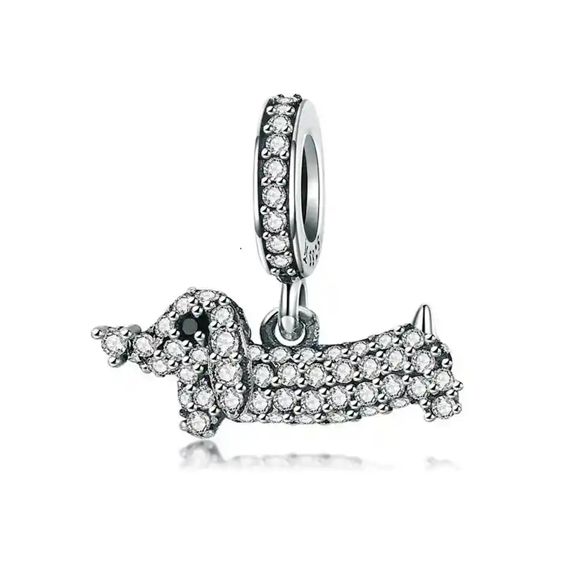 CHARM PERRO SALCHICHA CON CIRCONES Hermoso charm colgante con forma de perro salchicha, de circones, fabricado en plata 925 de primera ley y cristales, 100% compatible con pulseras de charm.