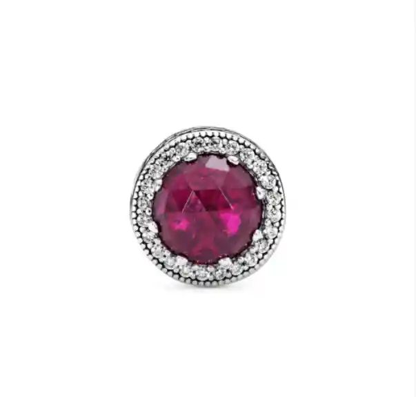 El charm está hecho de Plata esterlina 925 con su respectivo sello. Está incrustado de Zirconia cúbica y Silicone de color rubí. Es totalmente compatible con pulseras Pandora y cualquieras otras marcas europeas.