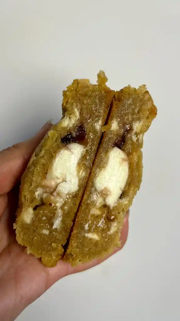 Mezcla de vanilla con chips de chocolate blanco, rellena de mermelada de fresa casera combinada con queso crema. Un cheescake dentro de una cookies.