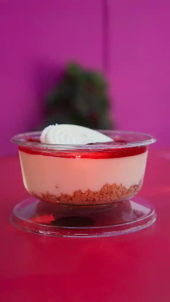 Postre suave y cremoso con base de galletas, relleno de queso crema y un toque de frambuesas naturales, coronado con una irresistible salsa de frambuesa fresca. Refrescante y elegante.