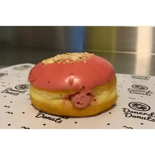 Donut rellena de queso crema con frambuesa, cubierta de fudge de frambuesa y topping de galleta molida.