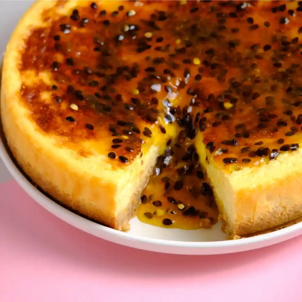 Base de galletas rellena con una mezcla de queso crema y cubierto con salsa de maracuyá. Formato: 15 personas