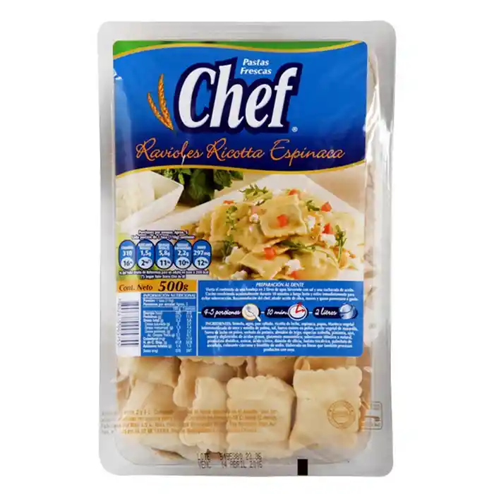 Los ravioles Chef son una exquisita pasta rellena con ricotta, espinacas y especias. Están listo en solo 10 min y son ideales para acompañar con variadas salsas blancas. Puedes congelarlas y no necesitas descongelarlas antes de cocinar. Contiene 500g. packing: Bolsa