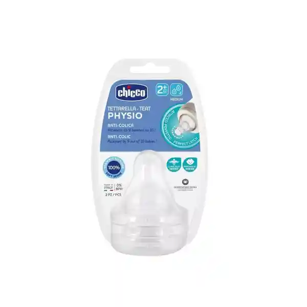 Pack Chicco Contiene 2 Unidades.Tetina de Silicone: Chicco Physio Teat es la Tetina Que se Adapta Perfectamente a la Boca Del Bebé y Respeta el Movimiento Natural de Succión. Anti Cólicos: La Válvula Anticólicos de Las Tetinas Physio de Chicco Ayudan a Evitar la Ingestión de Aire Reduciendo Así Las Regurgitaciones y Los Cólicos de Los Bebé Tras Las Tomas. Diseño: La Forma Simétrica Plana y Alargada de la Tetina Physio de Chicco Facilita la Aceptación Del Bebé Favoreciendo el Movimiento Peristáltico de la Lengua Durante la Succión. De Silicone: La Tetina Está Realizada en Silicone Extra Suave Con Acabado Soft Sense Ofreciendo al Bebé Una Sensación de Confort Que Facilita la Aceptación. Flujos: Disponible en Cuatro Flujos Diferentes: Lento Medio Rápido y Papilla.