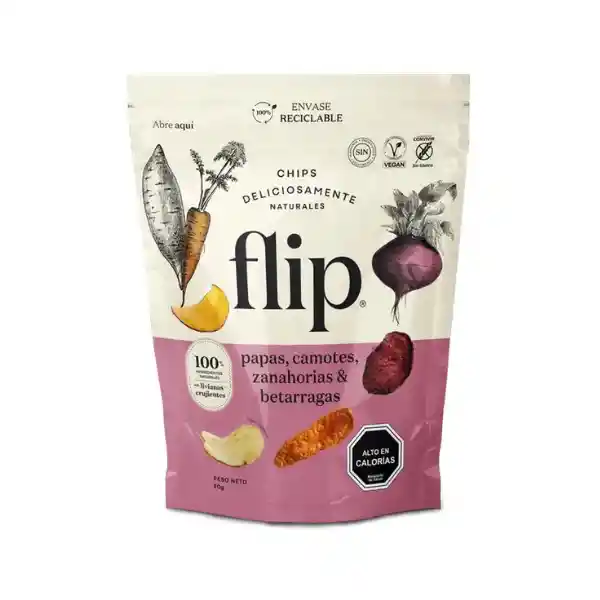 Chips de papas, camote, zanahoria y betarraga, bajos en absorción de aceite (60% menos). Fritos bajo un proceso único y patentado creado en Chile. Vegano | Sin gluten