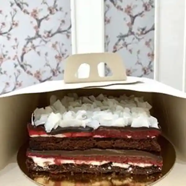 Bizcocho de cacao 100% pasta de coco gel de berries y ganache de chocolate bitter. 10-14 porciones 15 x 15 cm sin gluten .
