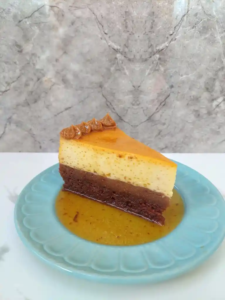 Perfecta combinación de crema volteada y Bizcocho de chocolate horneados juntos.