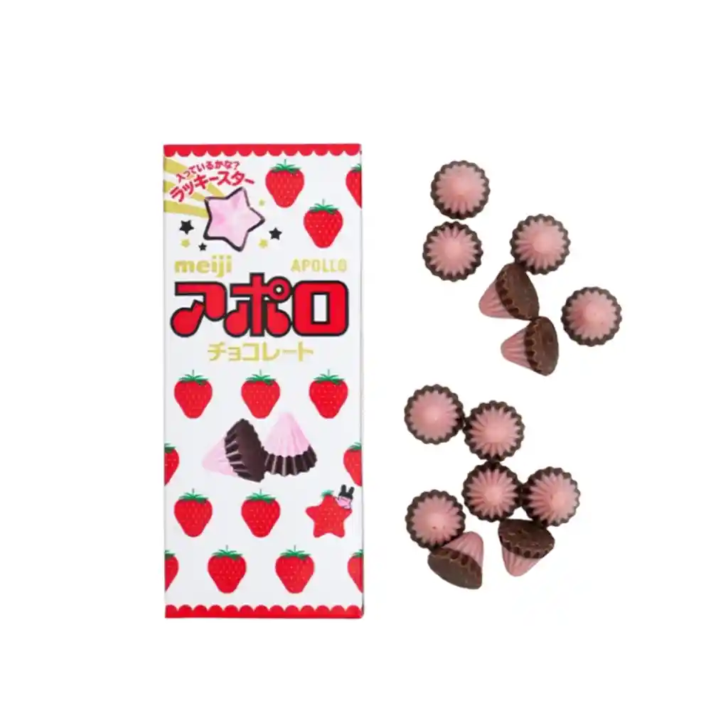 Meiji Apollo es uno de los dulces más vendidos en Japón. Cada cono es una mezcla en capas de chocolate con leche y crema de fresa, bastante buenos. El sabor a fresa combina con el chocolate. Es lo que esperarías de un bocadillo japonés económico.