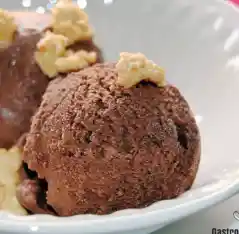 Helado de chocolate Belga sembrado con trocitos de nueces tostadas.
