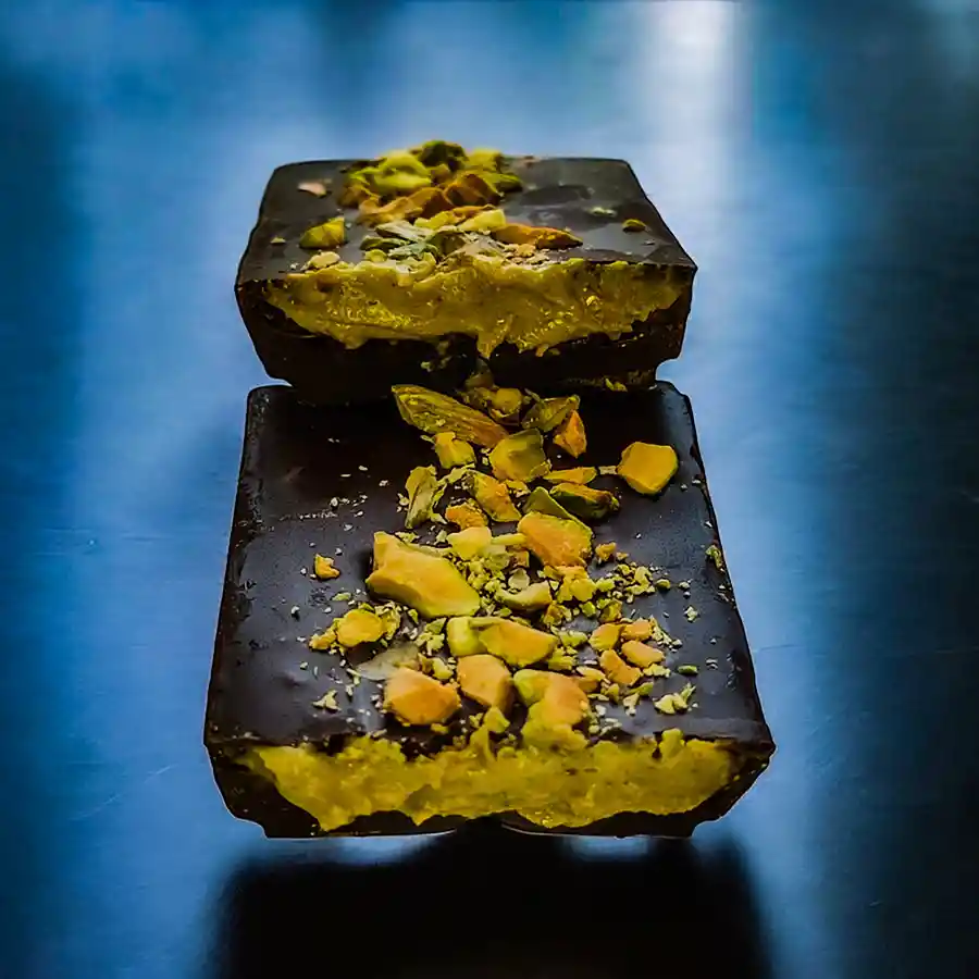 Chocolate de Dubái Sin Azúcar. 74% cacao premium ecuatoriano, relleno de pistacho y Kadaif (relleno crujiente)