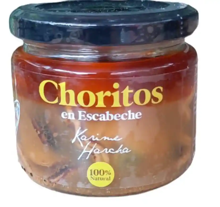 Tienen una salsa de color anaranjado debido a uso del pimentón, gratamente ácido, ideal para aperitivo o para servir junto a otros escabeches o encurtidos. Se usan también en platos de pastas o risottos. INGREDIENTES: Choritos, vinagre, aceite de maravilla, ajo, vino blanco, pimentón en polvo, sal, laurel.