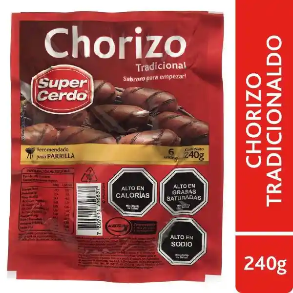 Chorizo de cerdo. Producto embutido de 40 grs. de peso promedio por unidad. Su interior corresponde a una masa carnica granulosa anaranjada. Formato en display sellado al vacío de 6 unidades de 240 grs. aprox.