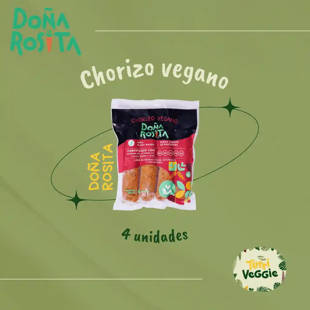 Chorizo veggie Doña Rosita 4 unidades. INGREDIENTES: Agua, proteína de soya NO GMO, cebada, gluten, almidón, ajo, aceite vegetal, cañihua, sal light, carragel, fibra vegetal, pimentón, orégano, merken, cebolla, humo líquido, comino, nuez moscada, calcio, hierro, zinc, Vit.B12, Vit. D3.