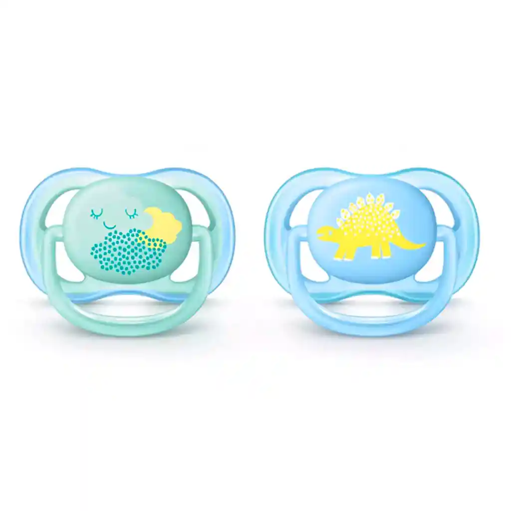 ORIFICIOS DE VENTILACIÓN Y ULTRA LIVIANO Un chupete liviano que favorece la respiración Tranquilice a su bebé con un chupón que permite que su piel respire. La colección ultra air de Philips Avent tiene orificios de gran tamaño para mantener la piel seca. Su cubierta liviana está diseñada para un flujo máximo de aire. Está disponible en varios colores y diseños. CUIDA EL DESARROLLO BUCAL Y ES LIBRE DE BPA Cuida el desarrollo bucal de tu pequeño con una tetina simétrica que respeta la forma natural del paladar, los dientes y las encías. El chupete está fabricado con materiales sin BPA (PP). Dimensiones: 13 x 5 x 8 cmPeso: 23g Material: Silicona libre de BPA Chupetes: 2 unidades Edad recomendada: 0 a 6 meses Higiene: puede esterilizarse, apto para lavavajillas, fácil de limpiar