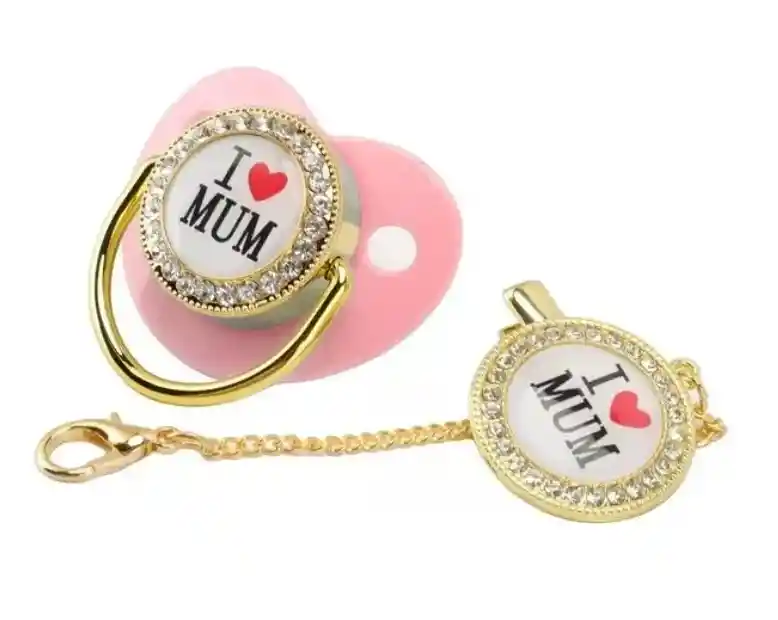 Paquete incluido: -- 1 chupete + 1 clip de cadena para chupete Características: -- Los diamantes de imitación de cristal en el chupete son extremadamente brillantes y hermosos, lo que atraerá al bebé. -Pezón de silicona ultrasuave, buen sabor de succión para el desarrollo oral natural, respeta el desarrollo natural de los dientes y las encías del bebé. -- Silicona sin olor, sin BPA, segura para el bebé.